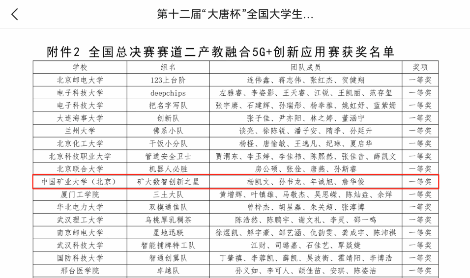 2025年7月10日至12日,第十二届“大唐杯”全国大学生新一代信息通信技术大赛全国总决赛在武汉理工大学圆满落幕。经过层层选拔和激烈角逐,由我院机械系商德勇教授指导的“矿大数智创新之星”本科生导师制团队,以《基于“5G+北斗”的智慧工地工程机械精细化管理系统——露天矿》为题,凭借扎实的专业功底和出色的创新能力,从全国数百所高校队伍中脱颖而出,最终荣获全国总决赛产教融合5G+创新应用赛大赛一等奖,充分展现了我院本科生导师制与人才培养成效。