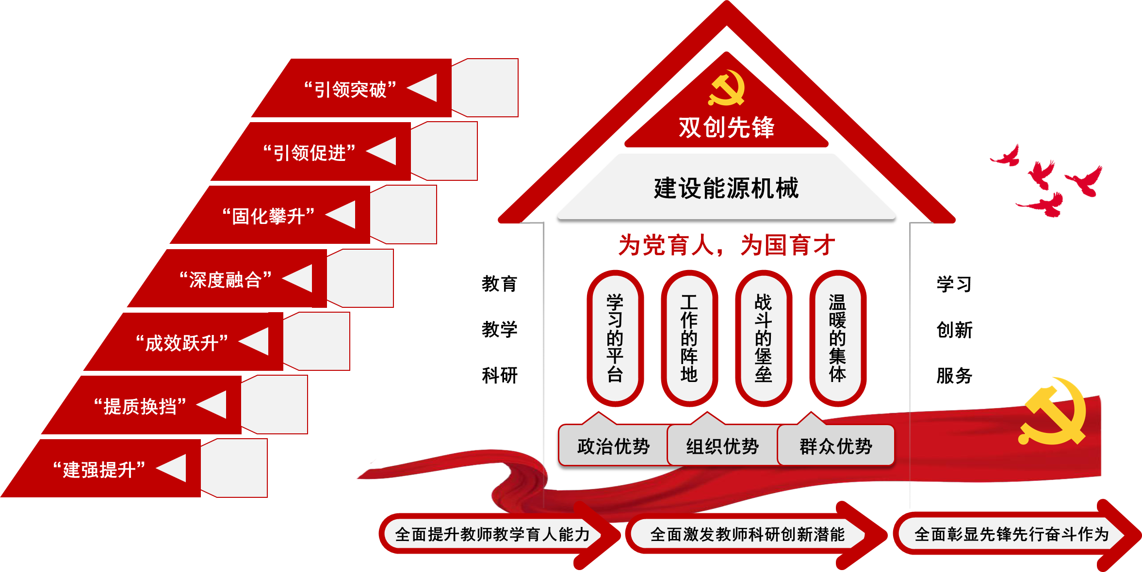 教工机械系党支部创新党支部工作法,以建设功能型党支部为目标,立足于服务制造强国战略和行业需求,推进党建和业务深度融合,在能源机械科技创新引领方面充分发挥先锋带头作用,实现能源机械发展方向从传统机械设计制造向智能化、AI方向转型升级;创建新型科技矿场学生创新实践基地,聚焦开发能源行业人才培养新模式,不断形成学科特色。