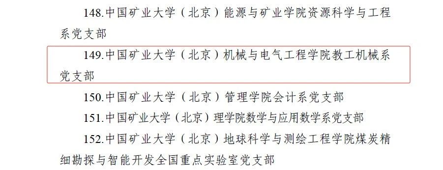 经高校推荐、专家评审、市委教育工委会议审议、结果公示等环节,北京市委教育工委公布了 100 个北京高校党建工作“标杆院系”、300 个北京高校党建工作“样板支部”和 100 个“党建引领实践创新示范项目”,中国矿业大学(北京)机械与电气工程学院教工机械系党支部入选北京高校党建工作“样板支部”培育创建单位。