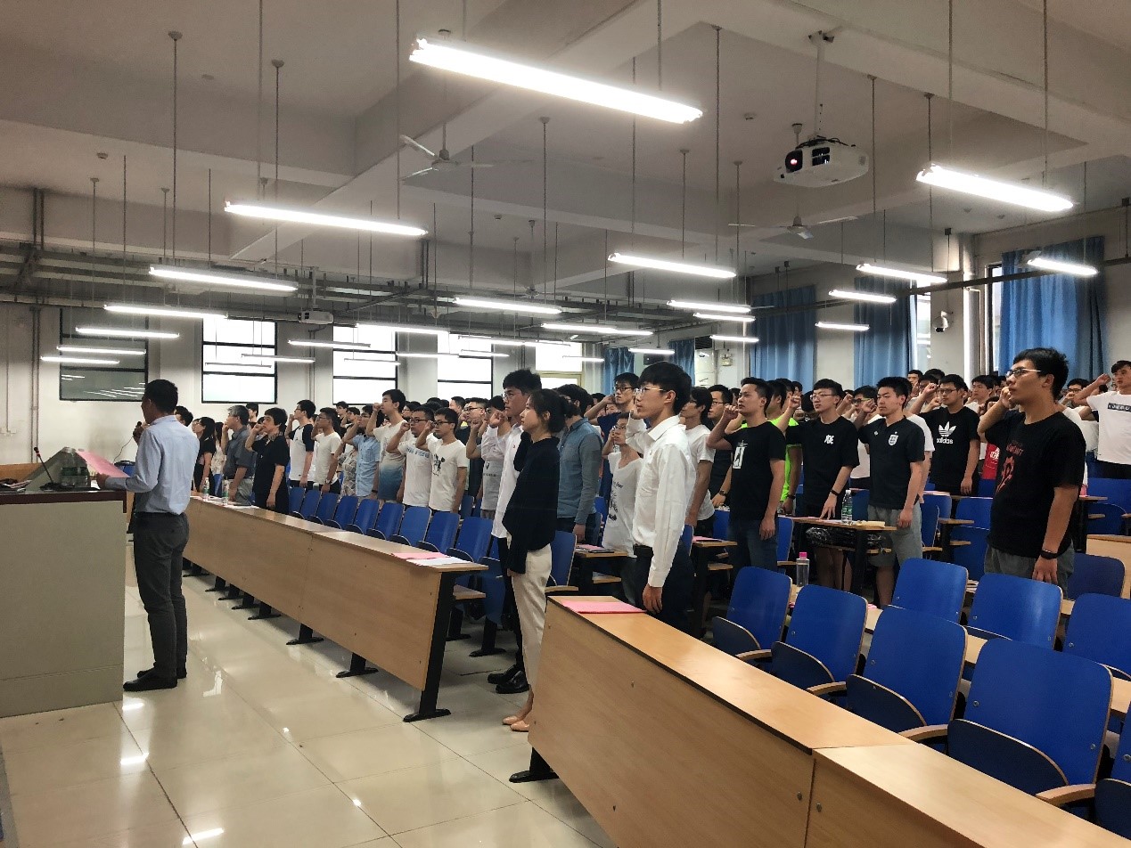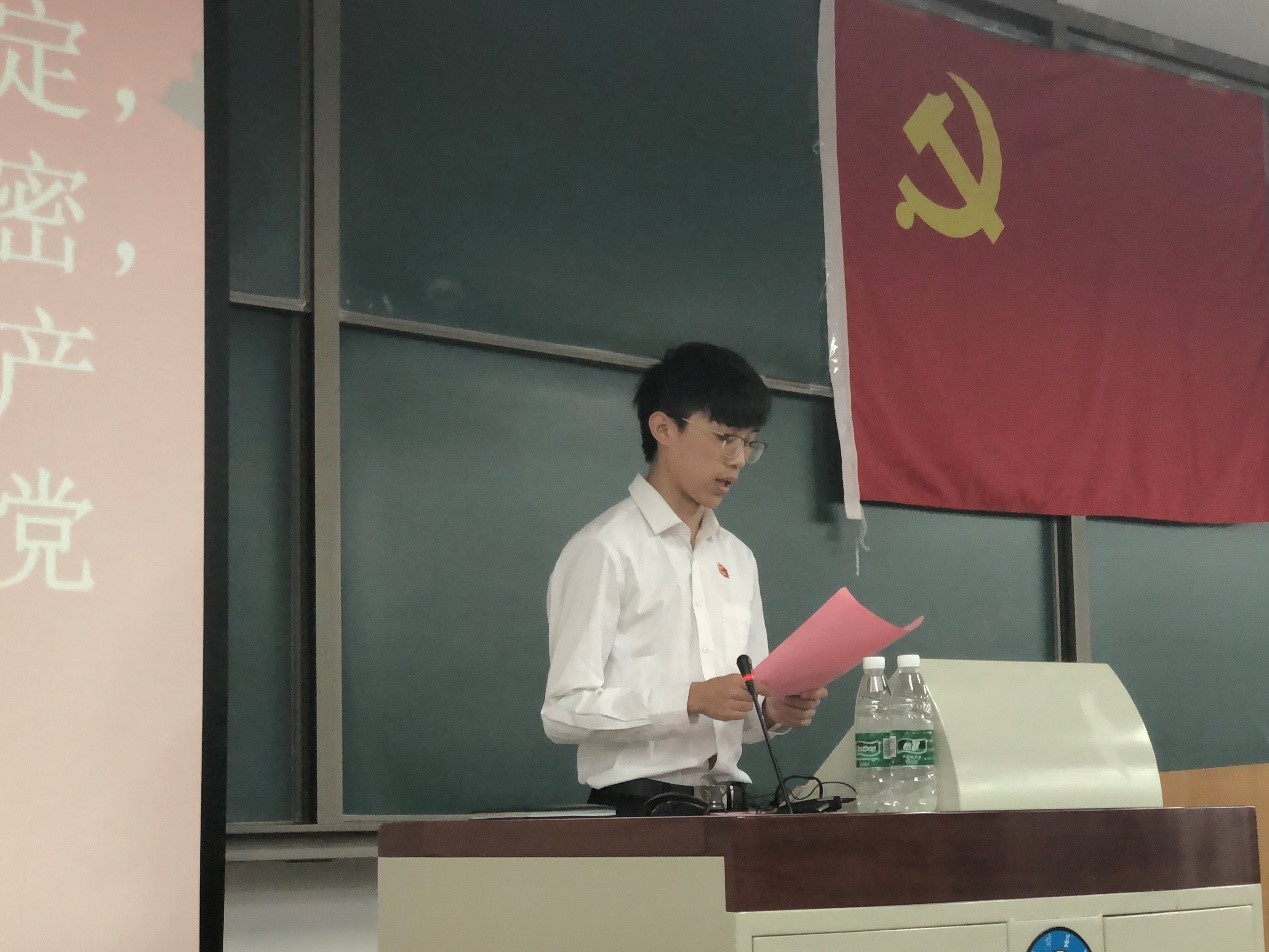大会在庄严的国歌声中开始,学院党委秘书韩小愚首先向大会宣读了新入党同学名单,学工办主任曹洪治带领全体新发展党员和毕业生党员面对党旗庄严宣誓。