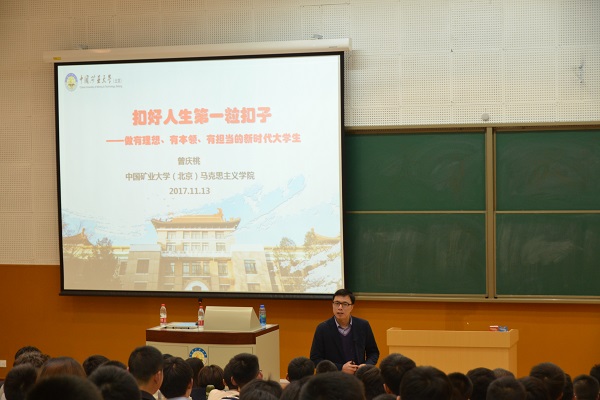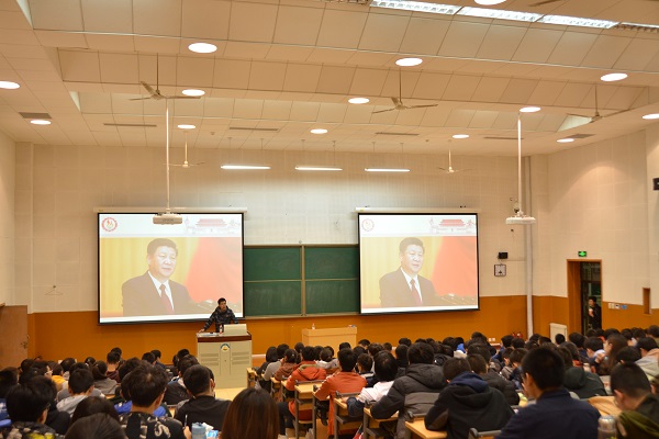 曾祥明老师以《走向复兴之路的思想启迪-深入学习习近平新时代中国特色社会主义思想》为题目,向学生们介绍了习近平总书记的从政之路和新时代中国特色社会主义思想,阐述了习近平新时代中国特色社会主义思想的精神实质,强调习近平总书记和全体共产党人的初心就是为人民服务和实现中华民族的伟大复兴。曾祥明老师为新生详细解读了习近平总书记的青年成才观,列举了青年成长成才的“二十力”,劝勉各位同学积极响应十九大的伟大号召,立志做一名有理想、有本领、有担当的青年。