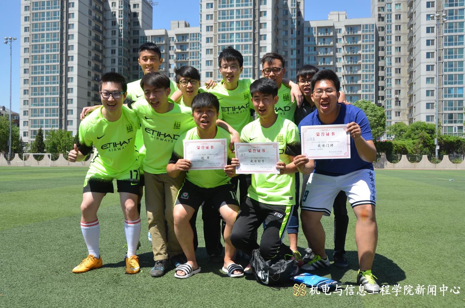 虽然每场比赛都有胜有负,但每一支足球队都给我们带来了不一样的精彩。亚军和季军队伍分别是15级信工测控队和14级材料队。与此同时,比赛还评选出了最佳射手周宇同学、最佳门将王铭豪同学。同时13级机械队凭借他们对赛事的热情获得了体育精神奖。薛光辉、吴晓、曹洪治、李运凯、高任佐、周轩老师分别为获奖队伍或个人颁奖。