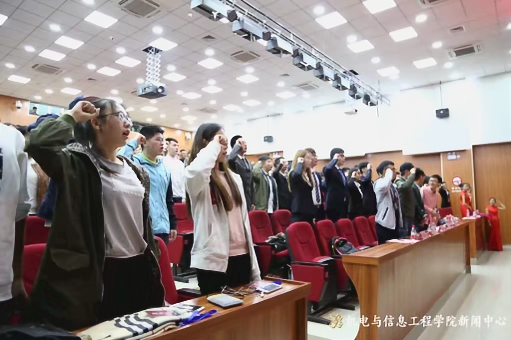 最后全体团学组织成员起立宣誓。各组织负责人为新成员们配发工作证,并合影留念。