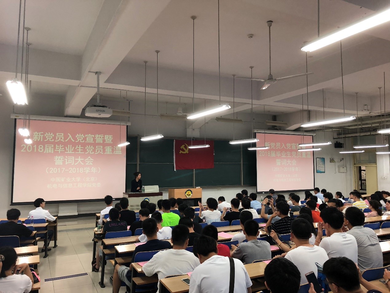 2018年6月19日下午,机电与信息工程学院党委在教学楼B114召开了“2017-2018学年度新党员入党宣誓暨毕业生党员重温誓词大会”。学院党委书记张晓红、学院党委副书记兼副院长翟国栋及辅导员出席大会,学院新发展党员115人、2018届毕业生党员149人、其他年级学生党员、积极分子代表约350人参加大会。