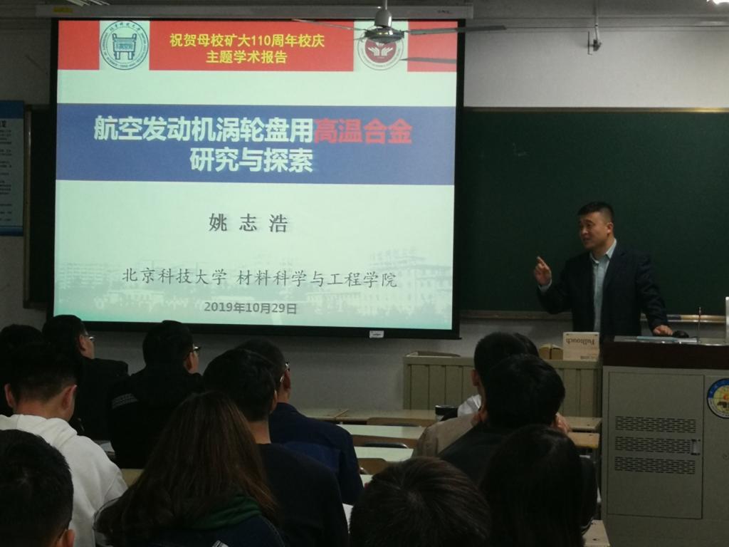 姚志浩简要回顾了当年在矿大(北京)求学期间的学习生活,感谢母校的培养。紧接着介绍了他本人目前所在的科研团队-北京科技大学高温合金团队,该团队历史较悠久、阵容强大、人才辈出、成果卓著,在国内高温合金领域处于领先地位,在国际上也具有重要影响。