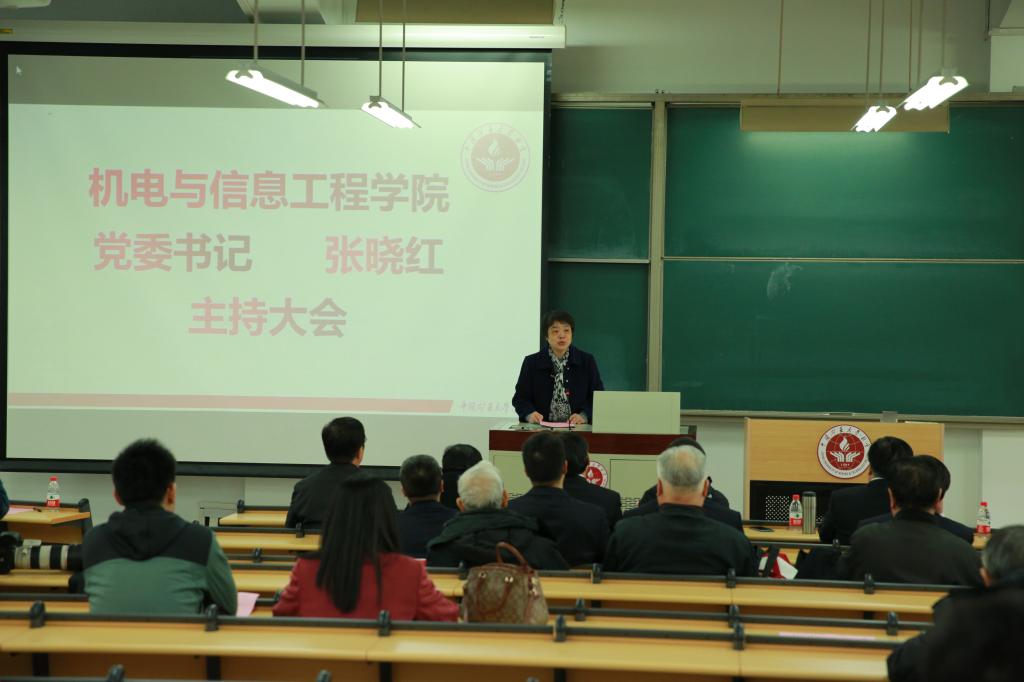明德至善百十载坚守薪火相传,好学力行新时代奋进英才辈出。2019年11月10日下午15:00,机电与信息工程学院建校110周年纪念大会在学院路校区教学楼209召开。中国工程院院士王国法、教师代表、原副校长范迅教授、原院长吴淼教授、孟国营教授、院长张晞教授、院党委书记张晓红以及学院领导班子全体成员出席大会。学院教师、学生代表以及来自全国各地的100余名校友参加大会。大会由院党委书记张晓红主持。