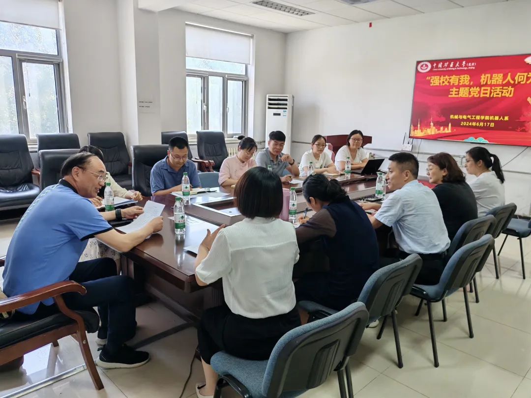 2024年6月17日下午,机器人系教工党支部在机电楼414会议室组织开展了“强校有我,机器人何为”主题党日活动。葛世荣院士、学院党委书记周媛出席本次活动,活动由支部书记李艳主持。