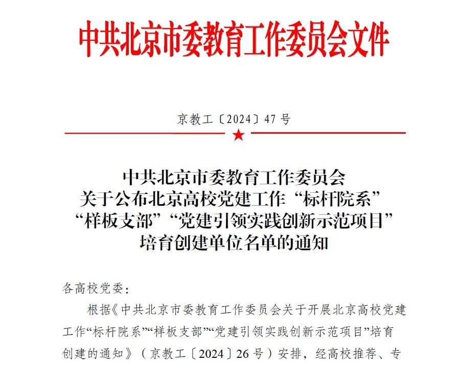 为促进基层党组织创优争先,发挥先进基层党组织的示范引领、辐射带动作用,中共北京市委教育工作委员会开展了高校党组织“对标争先”建设计划,进行“标杆院系”“样板支部”“党建引领实践创新示范项目”培育创建。