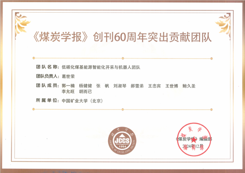 葛世荣院士领衔的《低碳化煤基能源智能化开采与机器人团队》荣获“《煤炭学报》创刊60周年突出贡献团队”称号。