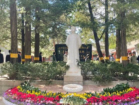 烈士陵园内,松柏凝翠,庄严肃穆;烈士昂首挺胸,背负双手,儒雅质朴,和蔼中透着百折不回的刚毅,传神地再现了李大钊同志伟大的风采。全体党员在李大钊烈士墓前整齐肃立,怀着崇敬之情行三鞠躬礼,并依次绕行瞻仰,以最诚挚的方式,寄托对革命先烈李大钊先生及无数英烈的无限敬仰与深沉追思。机电学院本科生第一党支部书记冯书尧带领全体党员重温入党誓词,铿锵誓言在陵园上空久久回荡,激励大家牢记党的宗旨、坚定理想信念,永葆共产党人的政治本色。
