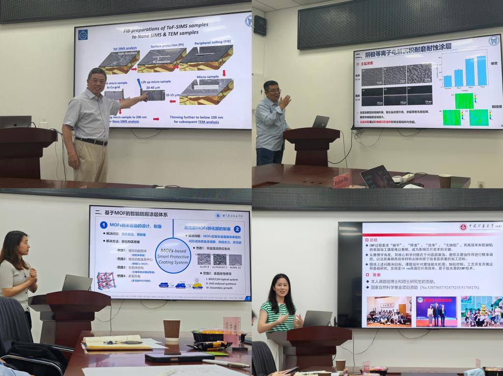 Pan教授作了题为“Correlative experiments and modeling to understand mechanism of copper corrosion”的报告,介绍了NanoSIMS和TEM技术在研究腐蚀性元素在晶界及晶粒内部渗透上的应用方法,并分享了使用密度泛函理论、机器学习和分子动力学模拟进行多尺度建模的一些相关案例成果和研究经验。北京科技大学的薛彦鹏副研究员作了题为“阴极等离子电解沉积镍基涂层及其应用”的报告、北京石油化工学院的张优副教授作了题为“基于纳米容器的智能防腐涂层设计与应用”的报告。最后,中国矿业大学(北京)的程洁教授作了“基于摩擦化学调控的高效率、原子级光滑的化学机械抛光技术”的报告,向各位专家汇报了课题组关于电子制造摩擦学方面的最新进展。