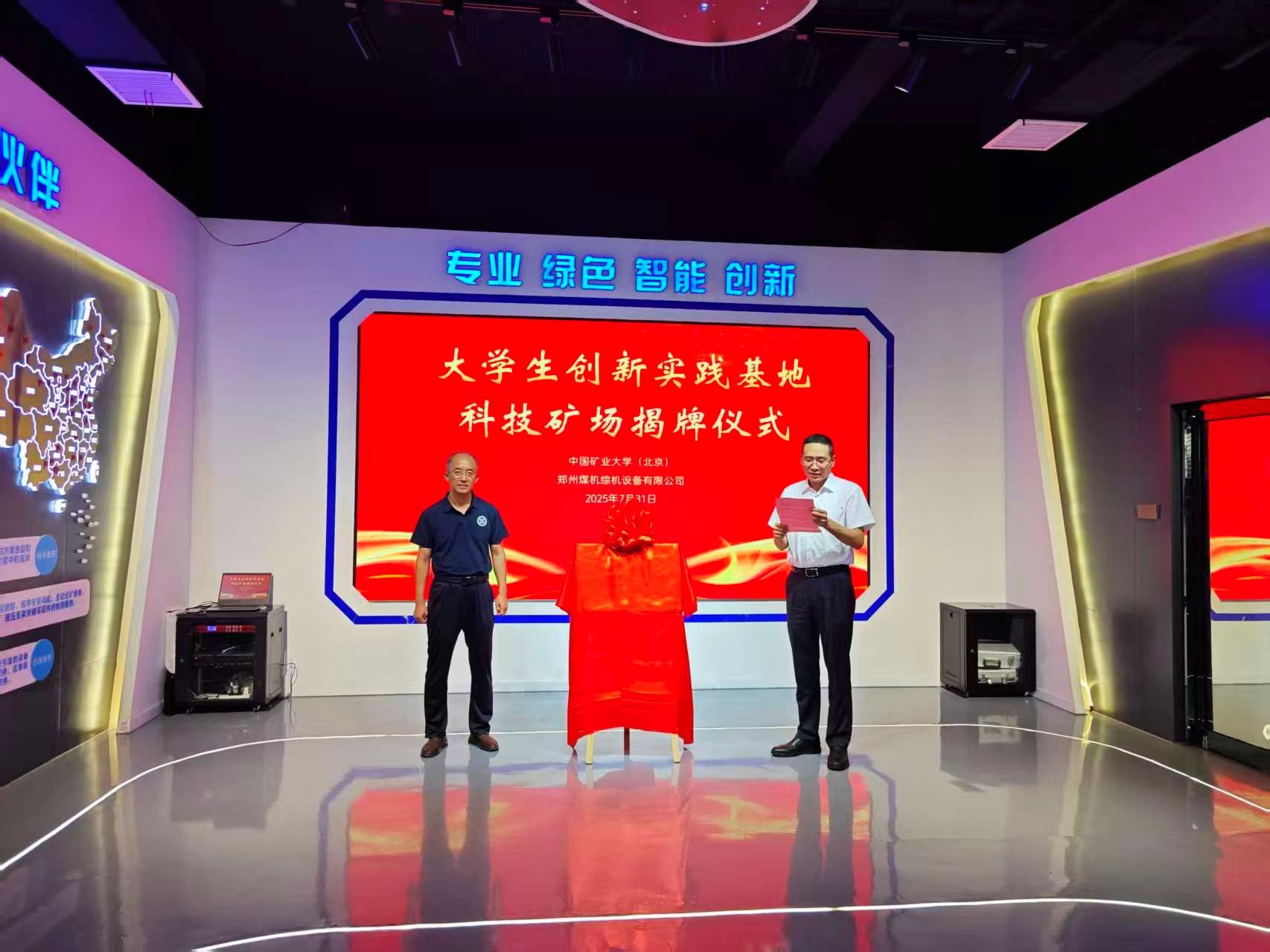 2025年8月31日,机电学院在郑州煤机综机设备有限公司举行了大学生创新实践基地科技矿场揭牌仪式,机电学院院长张晞、郑煤机综机公司总经理时岩出席并为中国矿业大学(北京)科技矿场揭牌。