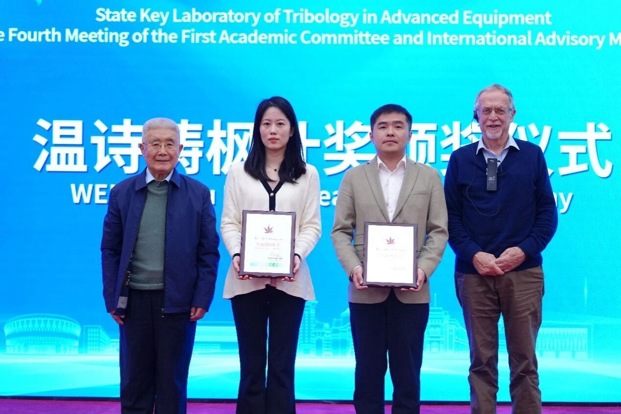 2025年11月4日,第十四届“温诗铸枫叶奖-优秀青年学者奖”颁奖仪式在清华大学举行,清华大学高端装备界面科学与技术全国重点实验室主任雒建斌院士、学术委员会葛世荣院士、杨华勇院士、首席咨询专家王玉明院士、郭东明院士、邓宗全院士、郭万林院士、严新平院士、王树新院士、国际咨询专家国际摩擦学理事会主席Nicholas Spencer教授等70余位国内外专家学者参加了本次会议。颁奖仪式由学术委员会主任葛世荣院士主持,我院程洁教授成为本年度两位获此奖项的学者之一,也是中国矿业大学(北京)首位荣获该奖项的青年学者。