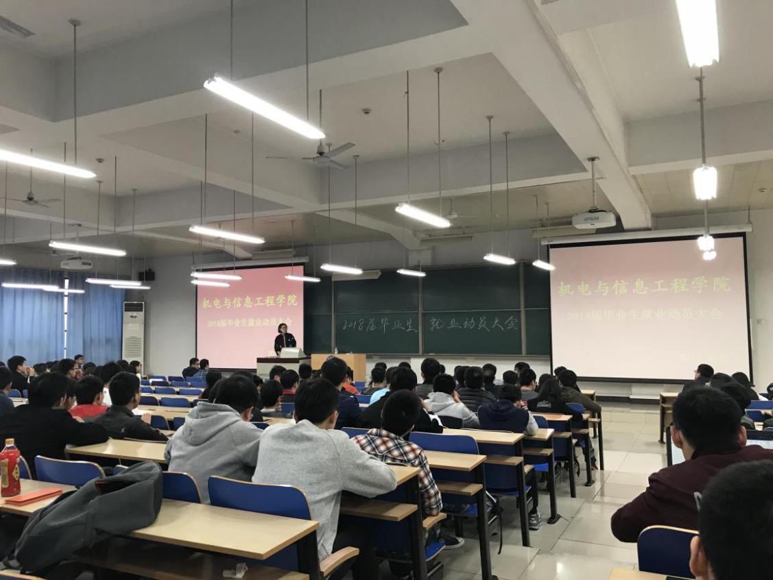 2017年10月26日下午15:30,我院在教学楼209举办了机电学院2018届毕业生就业动员大会。校学生工作处副处长、大学生就业创业指导中心主任高洁老师应邀做就业动员指导,学院党委副书记兼副院长翟国栋老师出席大会,学院学工办主任、研究生毕业生辅导员曹洪治主持大会,学院本科毕业生辅导员高任佐、研究生辅导员季如佳和学院2018届全体毕业生参加了本次大会。