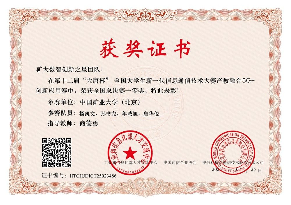 (6)柯昌徽,中共党员,中国矿业大学(北京)电气工程及其自动化专业2021级本科生,北京市优秀毕业生,国家奖学金获得者,以专业第一的成绩保送至华中科技大学攻读硕士学位。本科期间获各类荣誉超20项,本科毕业设计获评校级优秀本科毕业设计(论文)一等奖,曾获校级特等奖学金(连续三年)、龙软科技智慧矿山卓越奖学金,曾获全国大学生数学建模竞赛北京赛区一等奖、全国大学生数学竞赛一等奖、团体程序设计天梯赛全国总决赛团队三等奖。作为集体成员,所在团支部曾获评校级先进团支部,所在班级曾获评校级优良学风班,所在宿舍曾获评校级优良学风宿舍。积极投身志愿服务与社会实践,曾获评中国矿业大学(北京)2023 年大学生暑期社会实践先进个人,作为副领队参与的机电学院赴京“造炬成阳”社会实践团荣获优秀团队、优秀报告一等奖。